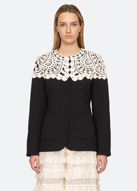 The Nara crochet jacket is defined by its handmade crochet applique detailing across the top of the jacket, lending an artisanal, vintage-inspired touch. Tailored to a refined silhouette and finished with oversized patch pockets, it embodies a polished, sculptural elegance. DETAILS - self-68% polyester, 23% viscose, 5% wool, 4% spandex - lining-52% polyester, 48% viscose - button front closure - designed for a slimmer fit - style #AW25-109 - model is 5'10'' and wearing a size S