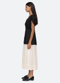 The Nicola dress features a deep v-neckline, pleated detailing and midi silhouette. DETAILS - self-100% ramie - lining-100% cotton - invisible back zipper - designed for a slimmer fit - style #PF25-080 - model is 5'10'' and wearing a size 4