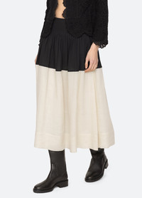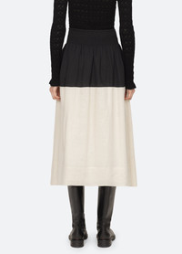 The Nicola skirt features an elasticized waistband, pleated detailing and midi silhouette. DETAILS - waistband-100% polyester - skirt panel-100% ramie - lining-100% cotton - slip on - elasticized back - designed for a slimmer fit - style #PF25-081 - model is 5'10'' and wearing a size S