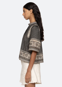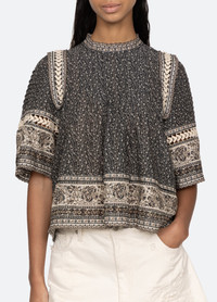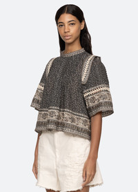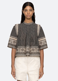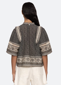 The Palma floral border print top features pleated detailing, short sleeves and embroidered detailing throughout. Designed for an easy, relaxed fit. DETAILS - self-100% cotton - lace-100% cotton - embroidery-100% polyester - button back fastening - designed for a relaxed fit - style #PF25-105 - model is 5'10'' and wearing a size S