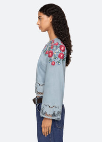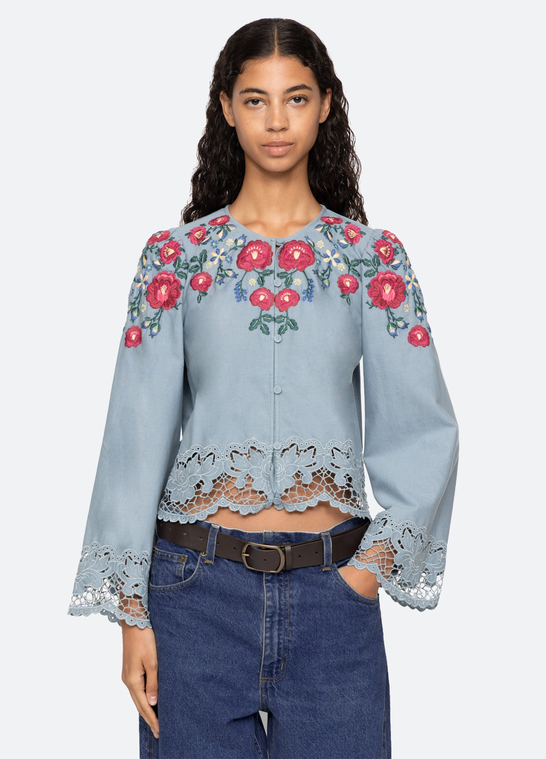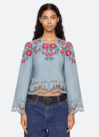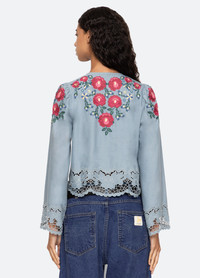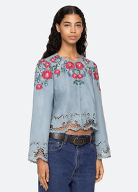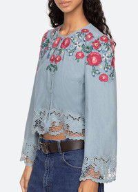 The Rosaline embroidered long sleeve top features voluminous long sleeves and intricate floral embroidery, creating a harmonious blend of timeless elegance and artistic craftsmanship. Its delicate lace trim and cropped silhouette add a modern twist to its classic feminine style. DETAILS - self-88% cotton, 12% linen - embroidery-100% polyester - button front - designed for a relaxed fit - style #AW25-060 - model is 5'10'' and wearing a size S