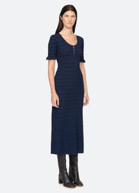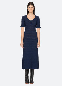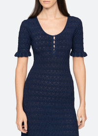 The Ruby fine gauge knit dress is woven with shimmering lurex threads and is designed with a flattering scoop neckline and framed by delicate ruffled sleeves, falling to a refined midi silhouette. DETAILS - self-83% viscose,17% elite - lining-92% nylon, 8% spandex - button front - designed for a slimmer fit - style #AW25-120 - model is 5'10'' and wearing a size S