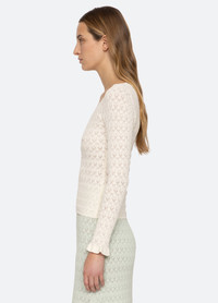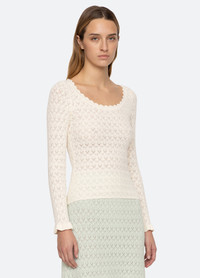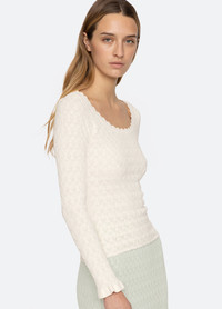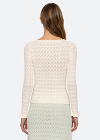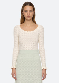 The Rue fine gauge knit long sleeve top features a scoop neck, ruffle cuffs and is designed for a slim fit. The perfect layering piece. DETAILS - 83% viscose, 17% elite - slip on - designed for a slimmer fit - style #PF25-082 - model is 5'10'' and wearing a size S