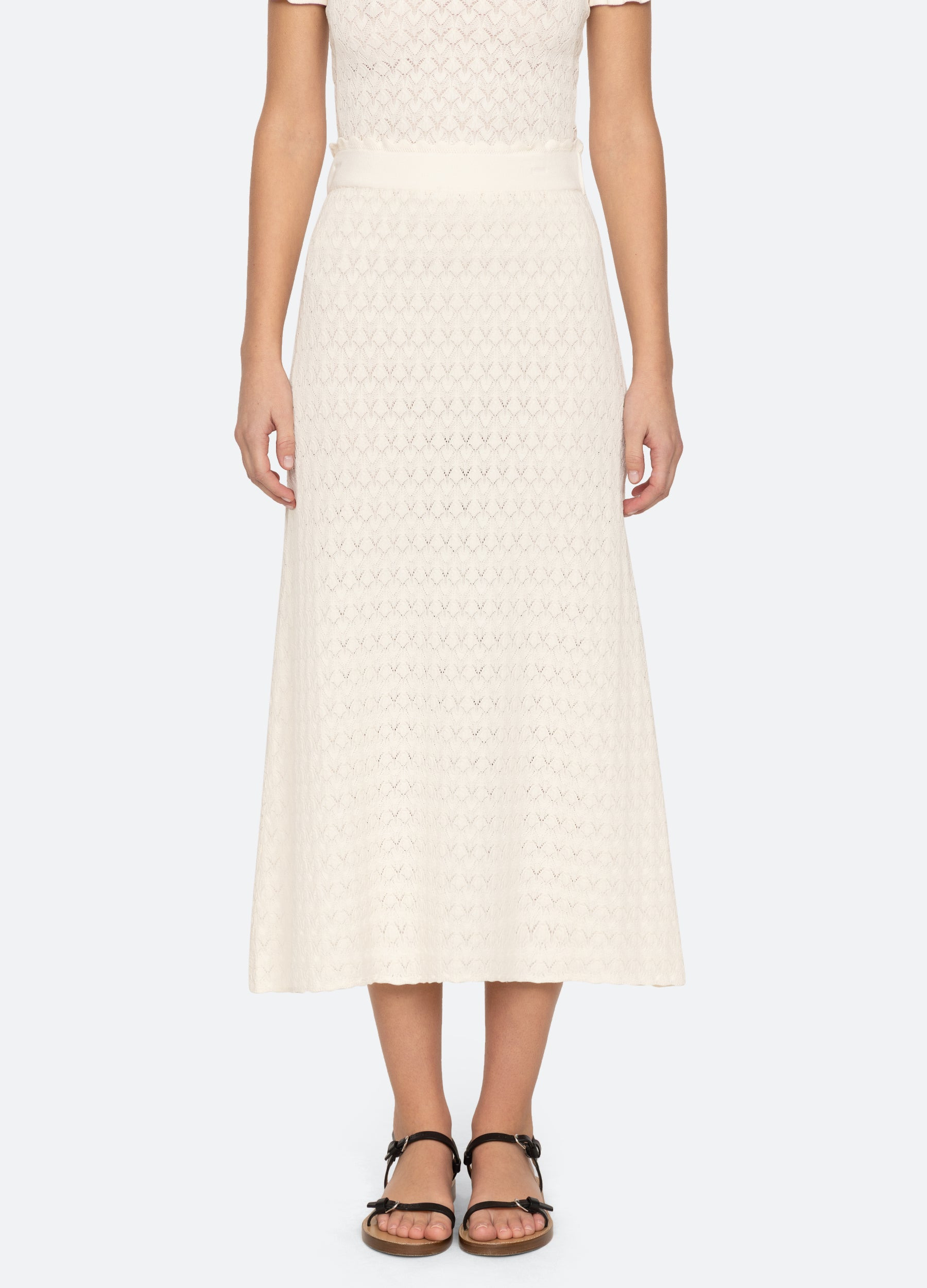The Rue fine gauge knit skirt features a scalloped waistband, midi silhouette and is designed for a slim fit. DETAILS - 83% viscose, 17% elite - slip on - designed for a slimmer fit - style #PF25-084 - model is 5'10'' and wearing a size S