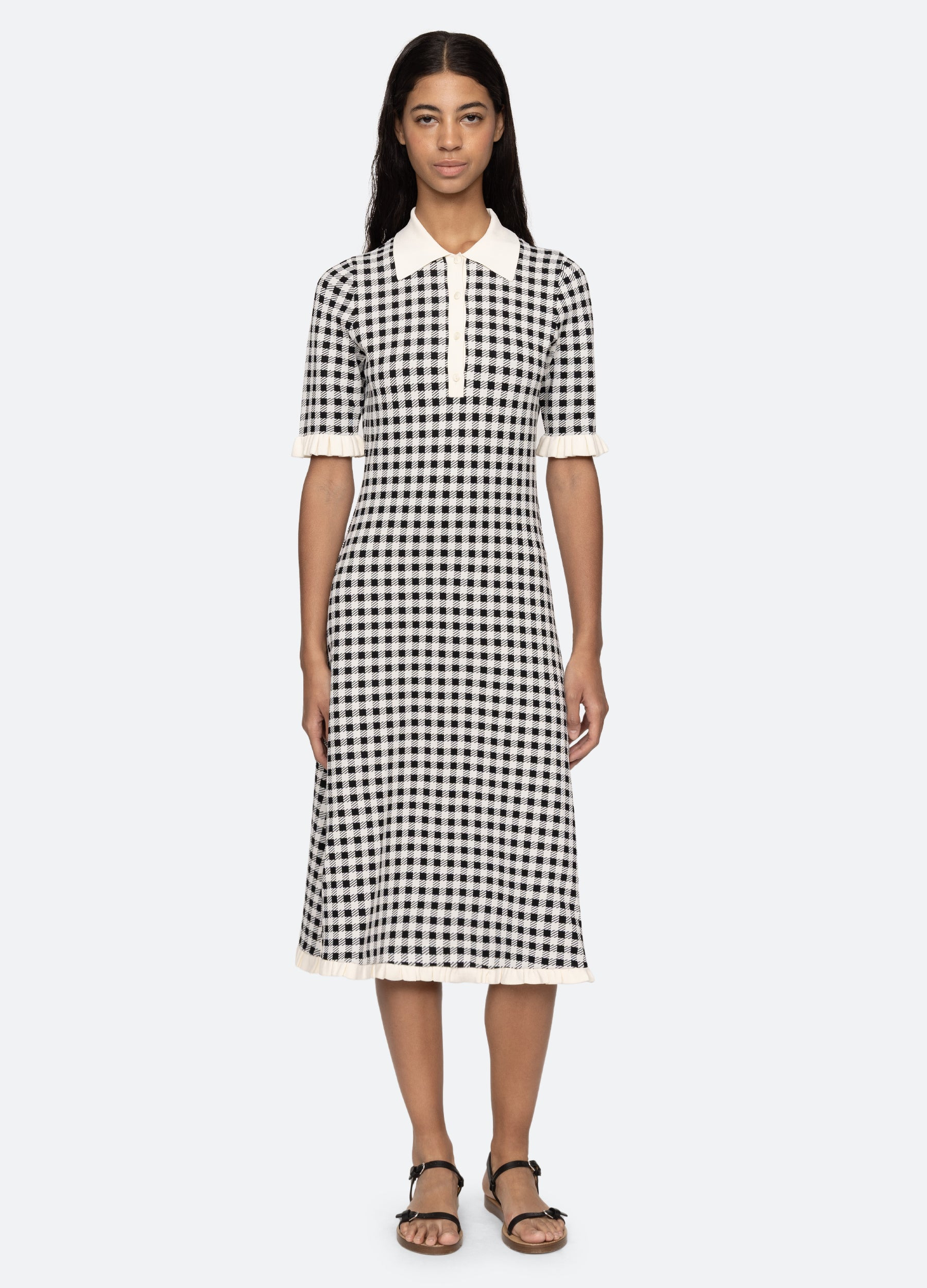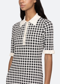 The Saige gingham knit dress features ruffle trim detailing and midi silhouette. DETAILS - 83% viscose, 17% elite - slip on - button front - designed for a slimmer fit - style #PF25-027 - model is 5'10'' and wearing a size S