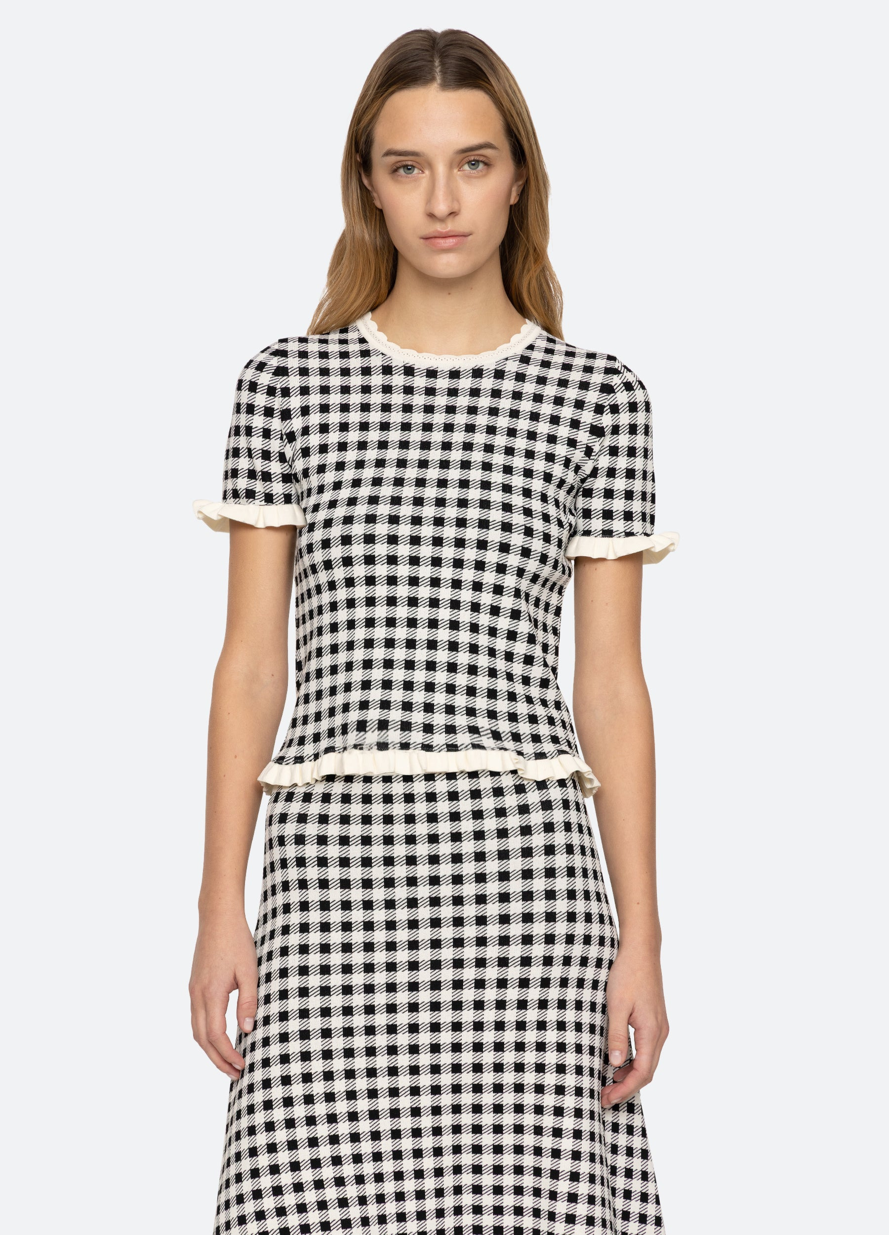 The Saige gingham knit top features ruffle detailing on the sleeves and is designed for a slimmer fit. DETAILS - 83% viscose, 17% elite - slip on - designed for a slimmer fit - style #PF25-025 - model is 5'10'' and wearing a size S