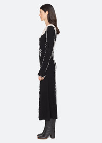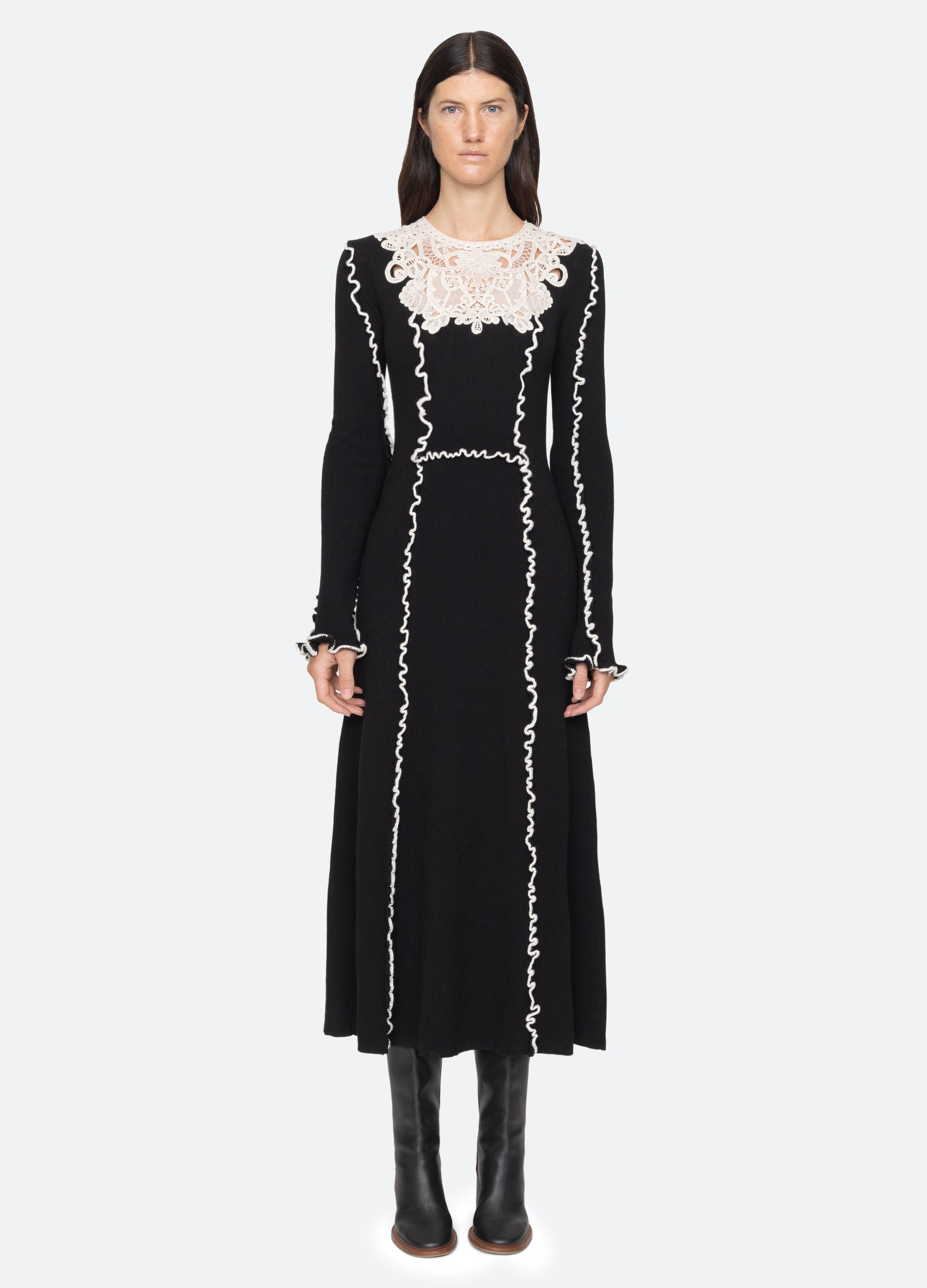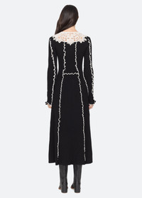 The Vania lace dress captures modern femininity through redefined contrasts- its ribbed knit body contours the frame, while the delicate lace yoke adds a touch of romance. Finished with a midi silhouette and contrast ruffle trim, this is the perfect addition to any wardrobe. DETAILS - self-100% extrafine merino wool - decoration-100% polyester - button back closure - designed for a slimmer fit - style #AW25-129 - model is 5'10'' and wearing a size S