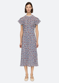 The Whitney floral print dress features flutter sleeves, delicate crochet detailing on the neckline and midi silhouette. DETAILS - self-100% viscose - lining-100% viscose - invisible back zipper - designed for a slimmer fit - style #PF25-029 - model is 5'10'' and wearing a size 4
