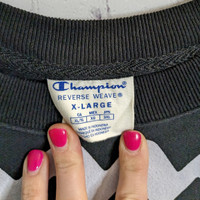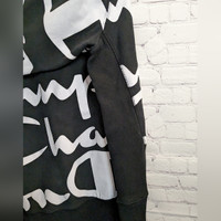 Champion Reverse-Weave Black, Crewneck Sweatshirt with bold White Spellout allover front and back Excellent Condition Men's Size XL Flat laid Measurements: Chest 27", Shoulders 21", Pit to waistline 17", Sleeve pit to wrist 23"