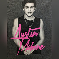 Austin Mahone Dark grey tshirt with image of Pop Star, name in large pink letters Gildan Softstyle - Poly/Cotton Size Women's Small Excellent condition