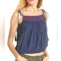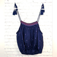 Free People Size Women's XS Eternal Love Tank color: Blue Embroidered across chest and small details throughout Rope ties at shoulder flanked with tassels elastic waistband 100% cotton VGUC!