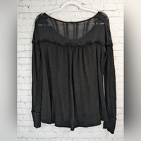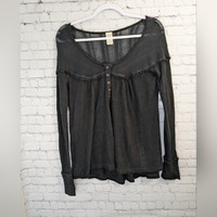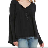Free People - We The Free New with tags! Size Women's XS Down Under Frayed Henley Top Long-sleeved with unfinished frayed hems Slight High-Lo Linen/Cotton blend with Cotton upper Color: black Flat laid Measurements: Pit to waistline 16/18", Chest 19.5"