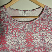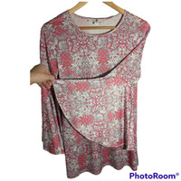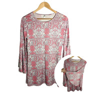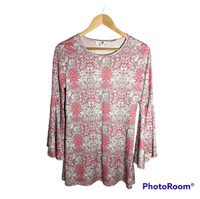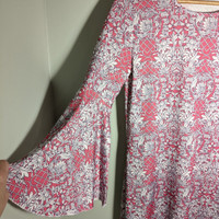 Jean-Pierre Klifa Paris Gorgeous!! Pink and White Floral Trellis print, Wide Bell Statement Sleeves, Rounded neck, Tunic length, Polyester-Spandex Size Women's Medium Measurements: Flat laid chest 18", Shoulders 15", Pit to hemline 19", Sleeve 17" (4.5" before flare).