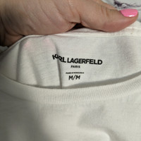 Karis Lagerfeld Paris Very soft, bright white, short-sleeved t-shirt Ribbed neckline Solid bule and red stripe with spellout across chest 100% Cotton Flat laid Measurements: Chest pit to pit: 20", Pit to waistline 18", Shoulders 18"