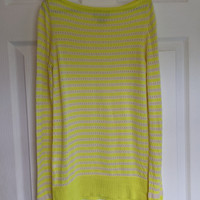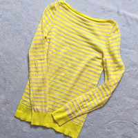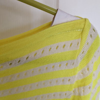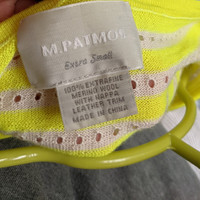 M. Patmos, size women's XS. Gorgeous, bright yellow and ivory, striped top with perforated dots throughout. Wide neck with Nappa leather trim. Made of 100% extra fine Merino wool. Gently used condition, note small hole on back of top, located about midway down. Measurements: chest 13", pit to waist 16.5", total length 23".