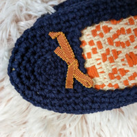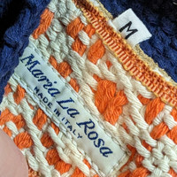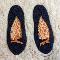 Maria La Rosa Navy blue Merino Knitted Slippers topped with Orange Bow Soft Leather Sole Hand Made in Italy Size Medium (outsole measures 9") Euro 38/39 Please refer to measurements in pictures