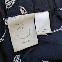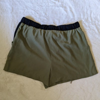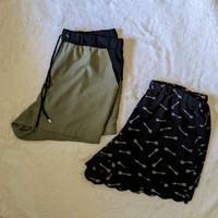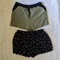 Bundle of Shorts, 2 pieces Mossimo - Green & Black Polyester Drawstrings Pocket Shorts, size Medium Eloise - Black with white arrows allover, elastic waistband, Double-ruffle Scallop trim, Pocket Shorts, size Large Flat laid Measurements: Mossimo waist 16", inseam 3", rise 13" Eloise waist 16", inseam 3", 12"
