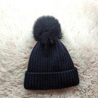 NWT Fox Pom Navy Ribbed Hat Jewel Changes Women's OS