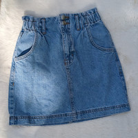 TOPSHOP New with Tags! High Waist, Paper Bag Denim Mini Skirt with rounded front pockets, back pockets, double button and zipper closure Women's Size 4 US Note: photos were taken outside - any discoloration seen is only from sun and shade and not present on skirt Flat laid Measurements: Waist (unstretched) 12" Hips 18", Total length 16"