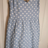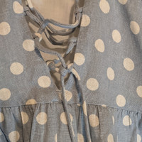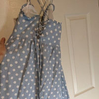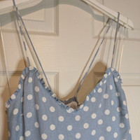 ZARA New with Tags! the sweetest mini dress! Linen/Viscose blend with poly/cotton lining Ruffle top, Spaghetti straps Side Zipper with Lace-up back Light blue with white dots allover Flat laid Measurements: Chest 16", Waist 15", Pit to bottom hem 21" long