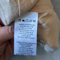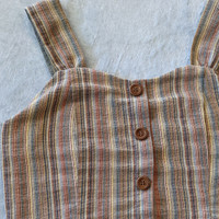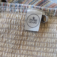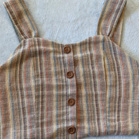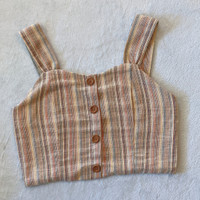 Paper Crane, size Medium. Earth-tone striped, faux button, lined crop top with gathered back for stretch. Polyester-cotton.
