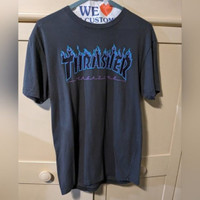 THRASHER MAGAZINE Charcoal grey, Short-sleeved T-shirt with Blue Flames Screen Print in excellent condition - no holes or stains on shirt Size Men's Small - Unisex Flait laid Measurements: Chest (pit to pit) 18" Total length (neck to waist) 28"