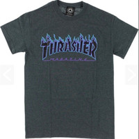 THRASHER MAGAZINE Charcoal grey, Short-sleeved T-shirt with Blue Flames Screen Print in excellent condition - no holes or stains on shirt Size Men's Small Flait laid Measurements: Chest (pit to pit) 18" Total length (neck to waist) 28"