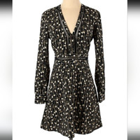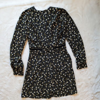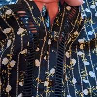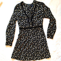 TOPSHOP Women's Size 4 Euro 36 Black Dress with White Pinstripe, yellow and white flowers allover V-neck, Perforated Cutouts down neckline and across waistline Long-sleeved, button closure at wrist cuffs Lightweight, 100% Polyester Like New! Flat laid Measurements: Chest 17", Sleeve pit to wrist 17", Pit to bottom hem 25", Shoulders 16", Waist 14"