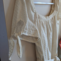 Universal Thread Size Women's Medium White Eyelet Lace Pattern with solid lining Scoop Neck Dress with bow-tie short-sleeves, belted waist 100% Cotton Worn once!