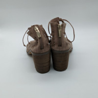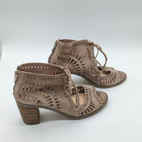 Vince Camuto Women's Tarita' Cutout Lace-Up Sandal 3" heel (size 9). 3 1/4" shaft. Lace-up style with back zip closure. Suede upper/leather lining/synthetic sole. By Vince Camuto Color Tan Women's size 6.5 VGUC First 3 photos stock images