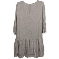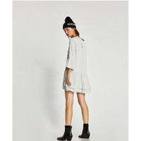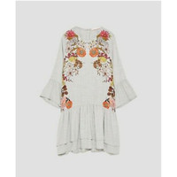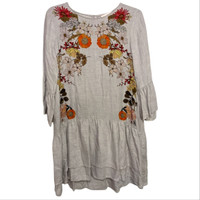 Zara Trafulac Grey Boho Drop Waist Dress with Fall Floral design Long-sleeved with ruffle trim at sleeves and hemline Peephole button closure at back neckline 100% Viscose Size Women's Large Flat laid Measurements: Chest p2p 20", Shoulder 16", Sleeve from pit 12", Pit to bottom hemline 24", hips where it meets ruffle 21".