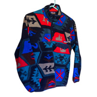 Patagonia Synchilla Fleece Pullover with snap button, high collar. Colorful, geometric pattern: Aztec Geo Cave in color Underwater Blue. Rare pattern and colors! Men's XS excellent condition!
