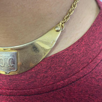 Authentic vintage Celine collar necklace in gold-tone metal featuring a bold crescent front plate and the iconic Celine shield logo at the center. This is a rare archival piece that reflects the timeless luxury and Parisian sophistication of the house of Celine. The necklace features a curved, polished front plate that sits comfortably around the neck in a collar-style fit, connected to double gold-tone chains. The silver-tone Celine crest emblem is raised in the center of the plate for a distinctive and elegant look. ⸻ Item Details: • Brand: Celine • Type: Collar Necklace / Choker • Material: Gold-tone metal (exact plating not specified) • Logo: Raised silver-tone Celine shield emblem • Chain Type: Double twisted chain • Length: Approx. 38 cm (15 inches) • Fit: Collar / Choker fit • Closure: Hook clasp • Condition: • Vintage condition with visible signs of wear • Notable area on the inside/back where gold plating has worn off (see last photo) • Light scratches and patina throughout consistent with age • No major structural damage • No box or receipt included ⸻ Notes: This is a rare vintage designer piece from Celine’s earlier collections, ideal for collectors or fans of classic archival fashion. The wear adds character and authenticity, making it a truly unique find. ⸻ 📦 Shipping & Handling Will be shipped securely with tracking. No original box or paperwork included. ⸻ 🔖 Tags: #celine #vintageceline #celinejewelry #luxuryaccessory #statementnecklace #collarnecklace #choker #archivalceline #designerjewelry #parisianstyle