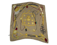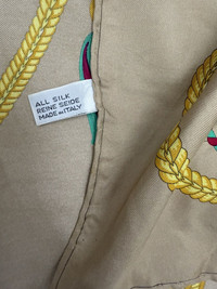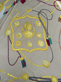 Brand: Celine Material: 100% Silk Size: (measure it) Design: Equestrian motif with gold rope and medal details Condition: (e.g. Excellent vintage condition, no snags or stains) Colors: Beige, gold, red, green Made in: Italy
