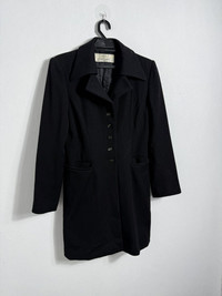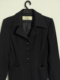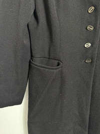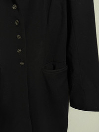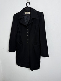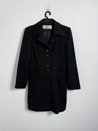 #A60 Elegant vintage Karl Lagerfeld long black jacket featuring a structured silhouette and classic tailoring. Designed with a pointed collar, button-front closure, and two front slit pockets for a refined yet versatile look. Fully lined for comfort and durability. Perfect as a layering piece for both formal and casual outfits. • Brand: Karl Lagerfeld • Color: Black • Material: Wool blend (lined interior) • Features: • Five-button front closure • Pointed collar • Longline tailored cut • Two front slit pockets • Condition: Good vintage condition, minimal signs of wear • Measurements: • Armpit to armpit: 22” • Length: 33” • Condition: Excellent, gently worn