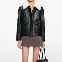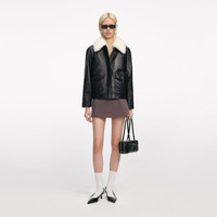 Details & Fit Effortlessly cool, this black leather jacket boasts a shearling collar for textural detail. Gunmetal buttons and a statement belt add slick accents – wear over cosy knits and slip dresses alike.Effortlessly cool, this black leather jacket boasts a shearling collar for textural detail. Gunmetal buttons and a statement belt add slick accents – wear over cosy knits and slip dresses alike. - True to size - Relaxed fit - Popper closure with concealed zip underneath - Functional pockets - Removable belt - Model is 5ft10/178cm and wears a size UK 6 - True to size - Relaxed fit - Popper closure with concealed zip underneath - Functional pockets - Removable belt - Model is 5ft10/178cm and wears a size UK 6 COMPOSITION Outer: 100% Calfskin Lining: 100% Polyester Outer: 100% Calfskin Lining: 100% Polyester