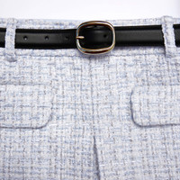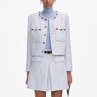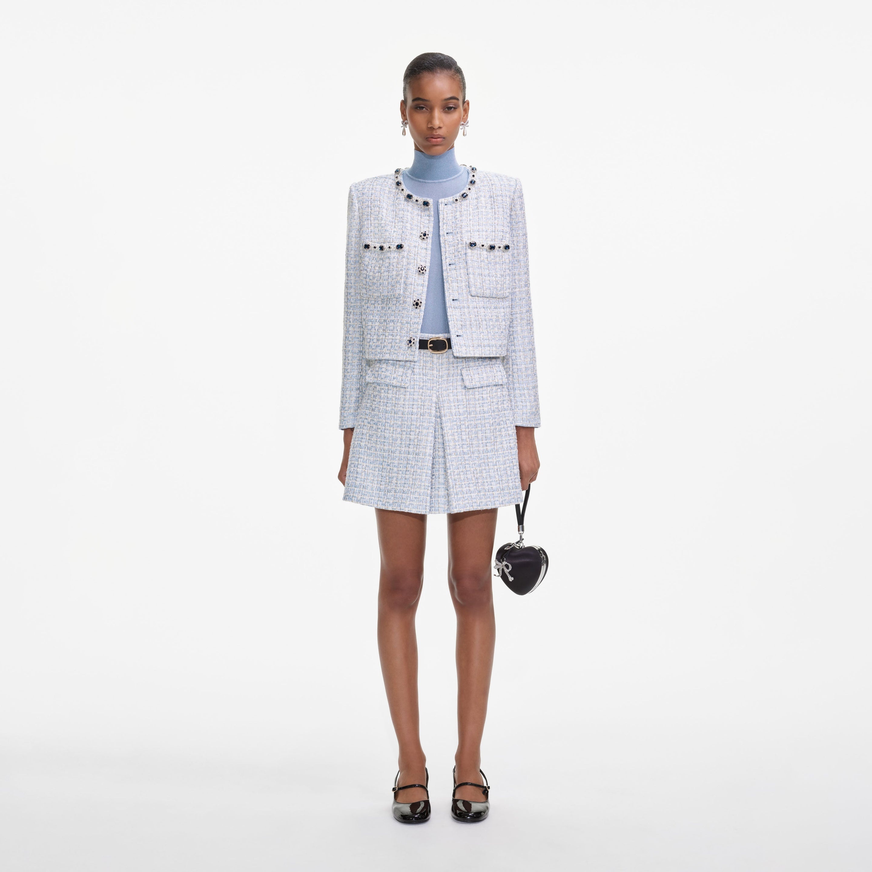 Details & Fit A house signature in baby blue boucle, this miniskirt features a large box pleat for added prep and polish. Style with a t-shirt for brunch and add the matching jacket for meetings that matter. - Fitted style, take one size up if between sizes - This style has minimal stretch - Zip closure at back - Removable belt - Matching jacket available - Model is 5ft10/178cm and wears a size UK 6 COMPOSITION Main: 98% Polyester 2% Metallised Fibre Lining: 100% Polyester