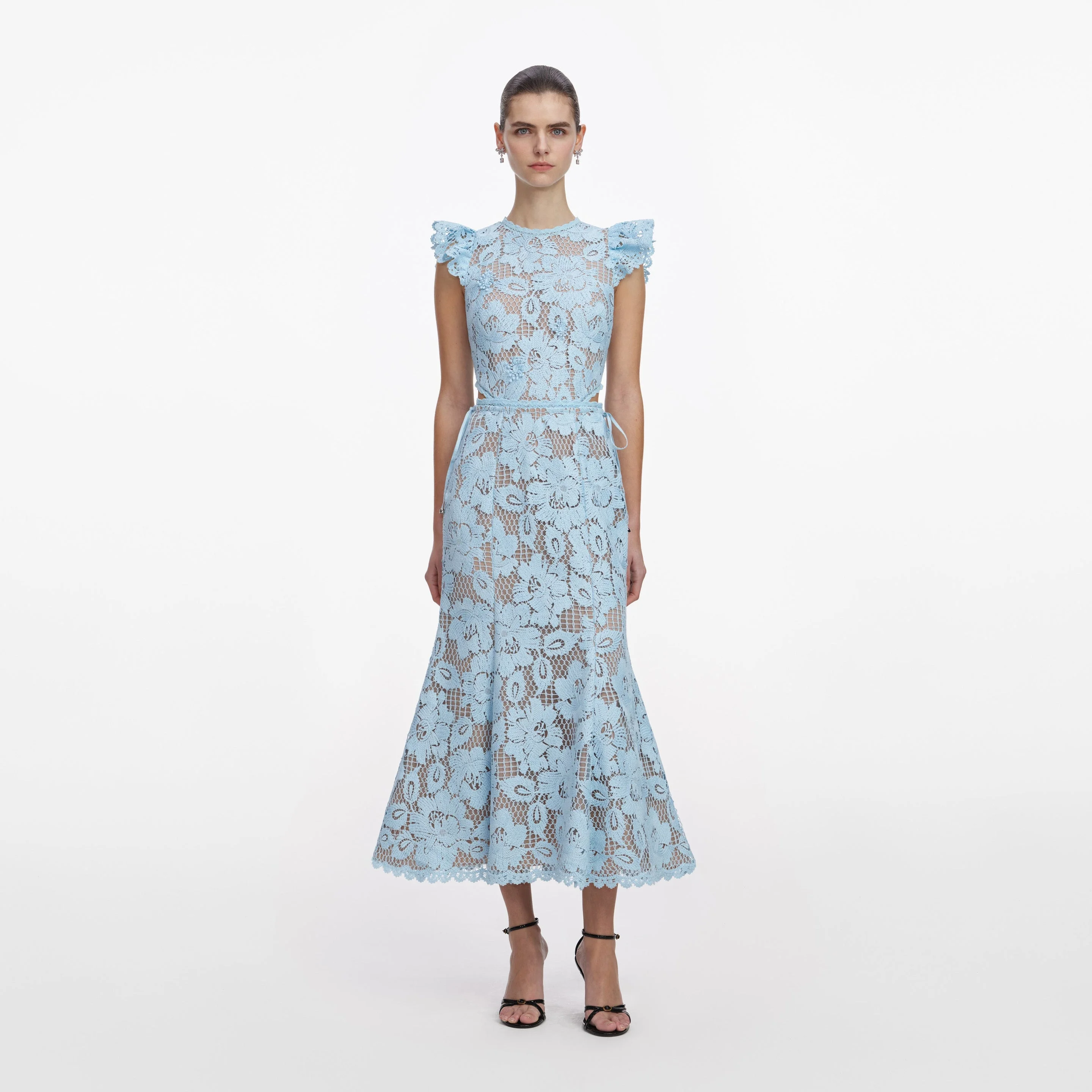 Details & Fit With nods to vintage floral crochet, this lace midi dress enchants in a soft baby blue hue. Delicate frills at the shoulder lend extra romance, whilst tie cut-out details bring a sensual flourish. - Fitted style - This style has minimal stretch - Concealed zip closure at back - Fully lined - Cut-outs at side - Model is 5ft10/178cm and wears a size UK 6 Composition Main Fabric: 100% Polyester Lining: 100% Polyester