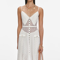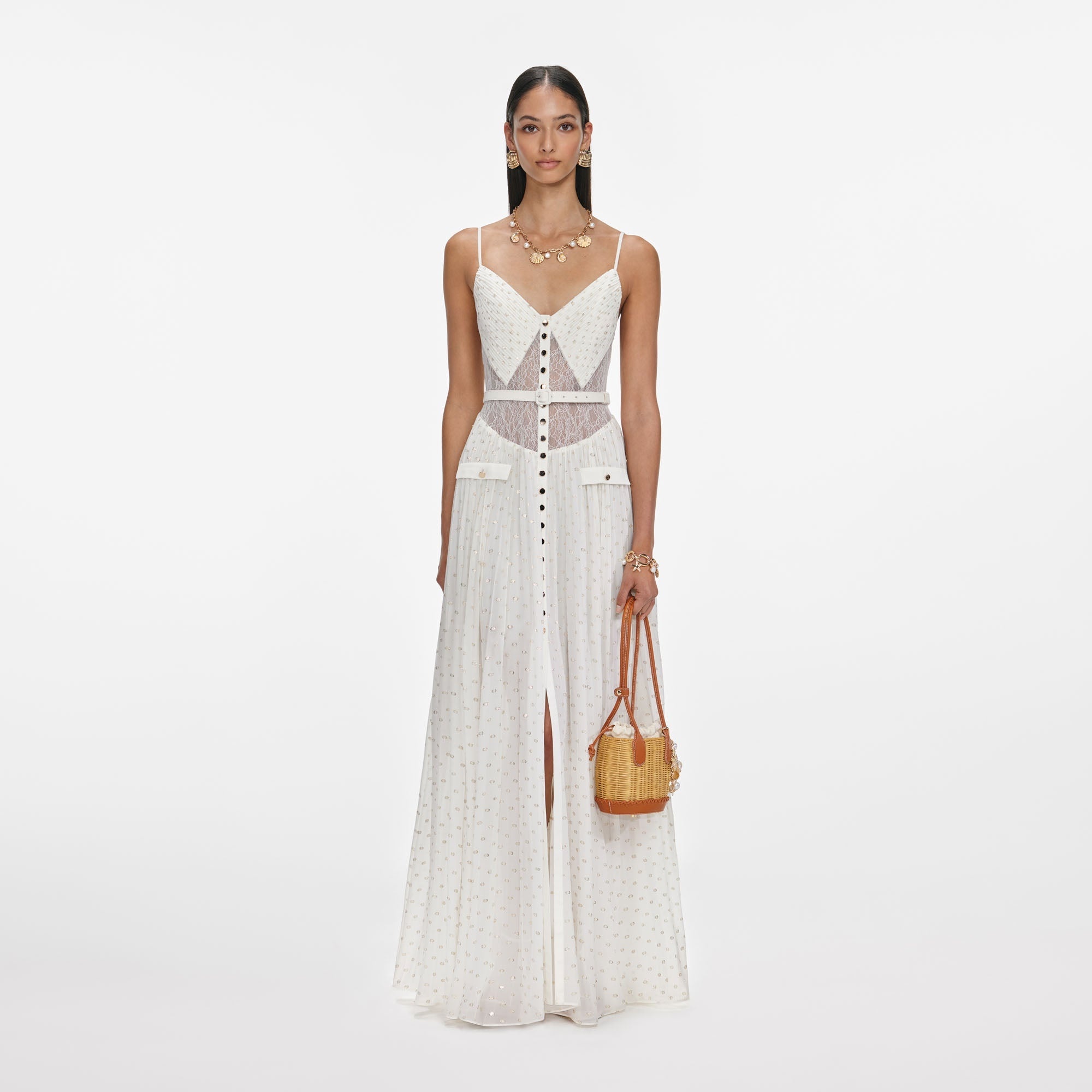 Details & Fit See and be seen in this cream chiffon maxi which features peekaboo lace panels and a sultry slit in the skirt. Belted at the waist, gold buttons bring extra glamour – add heels to make an entrance.See and be seen in this cream chiffon maxi which features peekaboo lace panels and a sultry slit in the skirt. Belted at the waist, gold buttons bring extra glamour – add heels to make an entrance. - Fitted style, take one size up if between sizes - This style has minimal stretch - Lace panelling at bodice - Slit detail in skirt - Removable belt - Model is 5ft10/178cm and wears a size UK 6 - Fitted style, take one size up if between sizes - This style has minimal stretch - Lace panelling at bodice - Slit detail in skirt - Removable belt - Model is 5ft10/178cm and wears a size UK 6 COMPOSITION Main Fabric 1: 97% Viscose 3% Metallised Fibre Main Fabric 2: 100% Polyamide Lining 1: 100% Polyester Lining 2: 100% Polyamide Belt: 100% Polyester (Exclusive Of Trimmings) Main Fabric 1: 97% Viscose 3% Metallised Fibre Main Fabric 2: 100% Polyamide Lining 1: 100% Polyester Lining 2: 100% Polyamide Belt: 100% Polyester (Exclusive Of Trimmings)