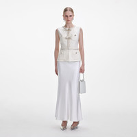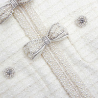 Details & Fit A lesson in elegant contrasts, this dress marries cream boucle with a flowing satin midi skirt. Accentuated by a belted peplum waist, embellished trims and bow detailing add irresistible shine. - Fitted style, take one size up if between sizes - This style has minimal stretch - Invisible zip closure - Removable belt & brooch - Functional pockets - Model is 5ft10/178cm and wears a size UK 6 COMPOSITION Main: 63% Acrylic 17% Polyester 14% Wool 5% Polyamide 1% Metallised Fibres Main 2: 100% Polyester Linijng: 100% Polyester
