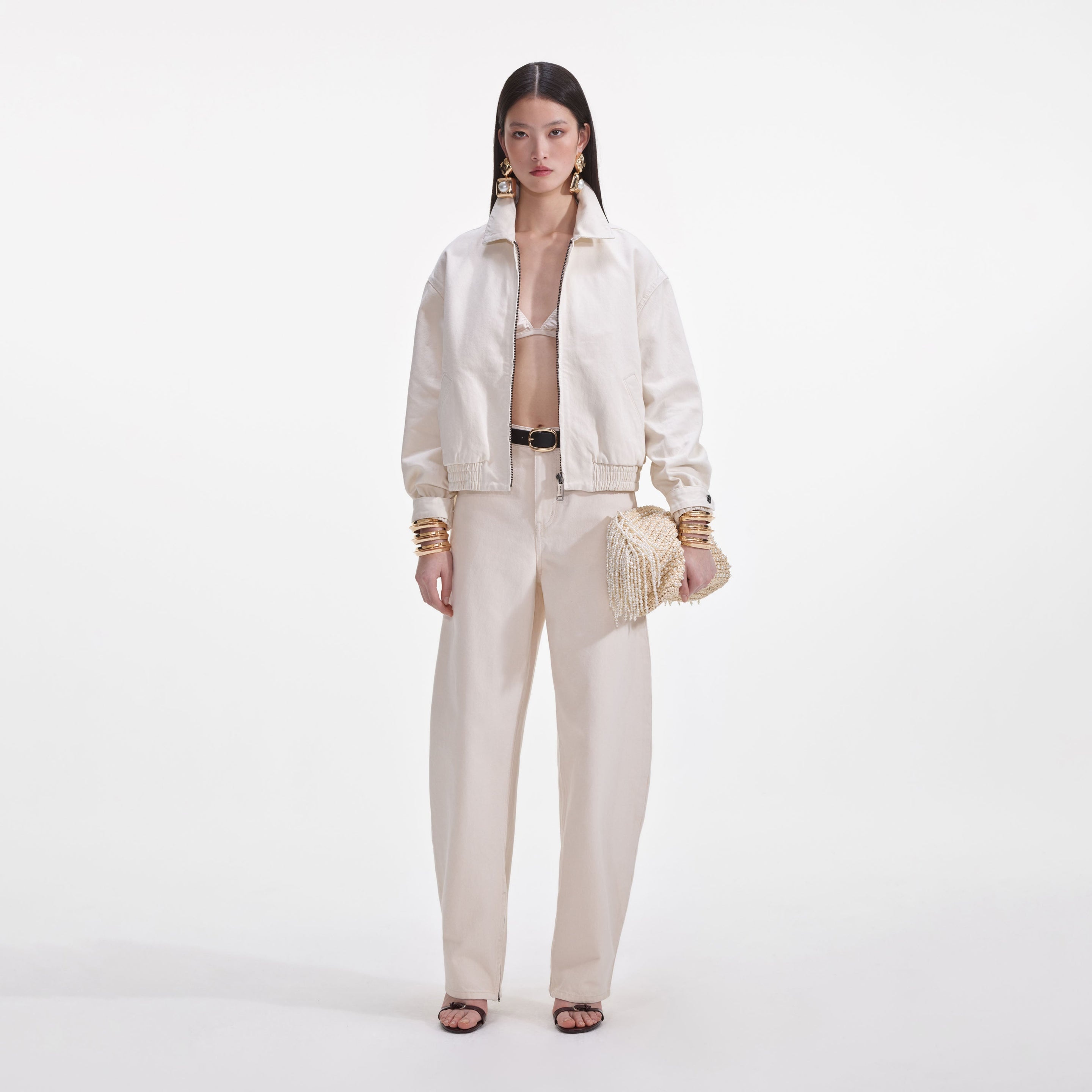 Details & Fit Lightweight and versatile, this cream denim jacket features a revere collar and relaxed fit. An elasticated waist nips in the form – wear with baggy jeans and party minis alike for effortless chic. - True to size - Relaxed fit - Zip closure at front - Functional pockets - Model is 5ft10/178cm and wears a size UK 8 - Check the Size Guide to find your perfect fit COMPOSITION Main Fabric: 100% Cotton Lining: 65% Polyester 35% Cotton