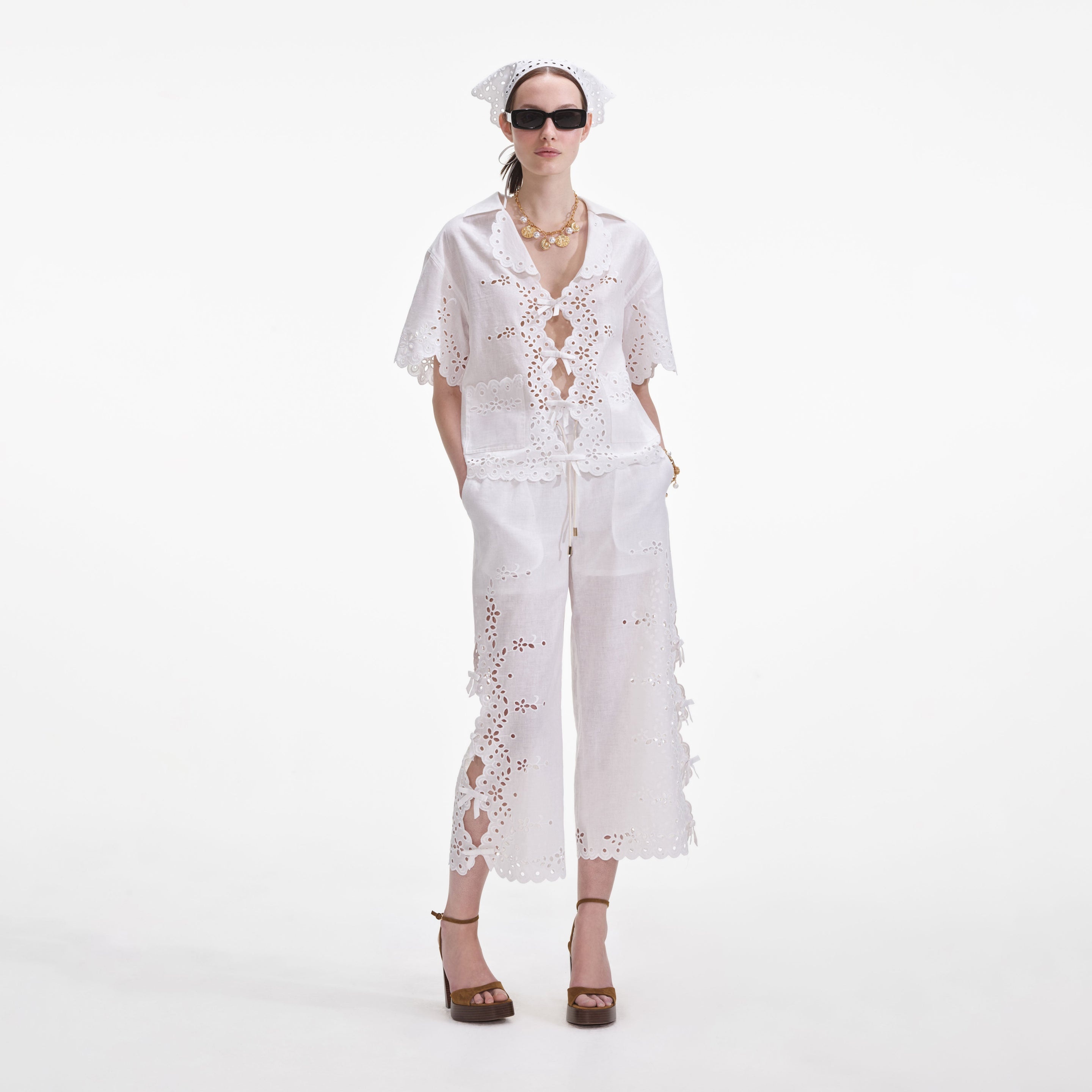 Details & Fit Light and airy, this embroidered linen shirt is framed by a revere collar and tie bow motifs. Key-hole accents add sensual detail – pair with a bikini and the matching trousers for pool party chic. - True to size - Relaxed fit - Decorative bows at front - Unlined style - Matching trousers available - Model is 5ft10/178cm and wears a size UK 6 COMPOSITION Main: 54% Linen 46% Cotton Lining: 100% Cotton