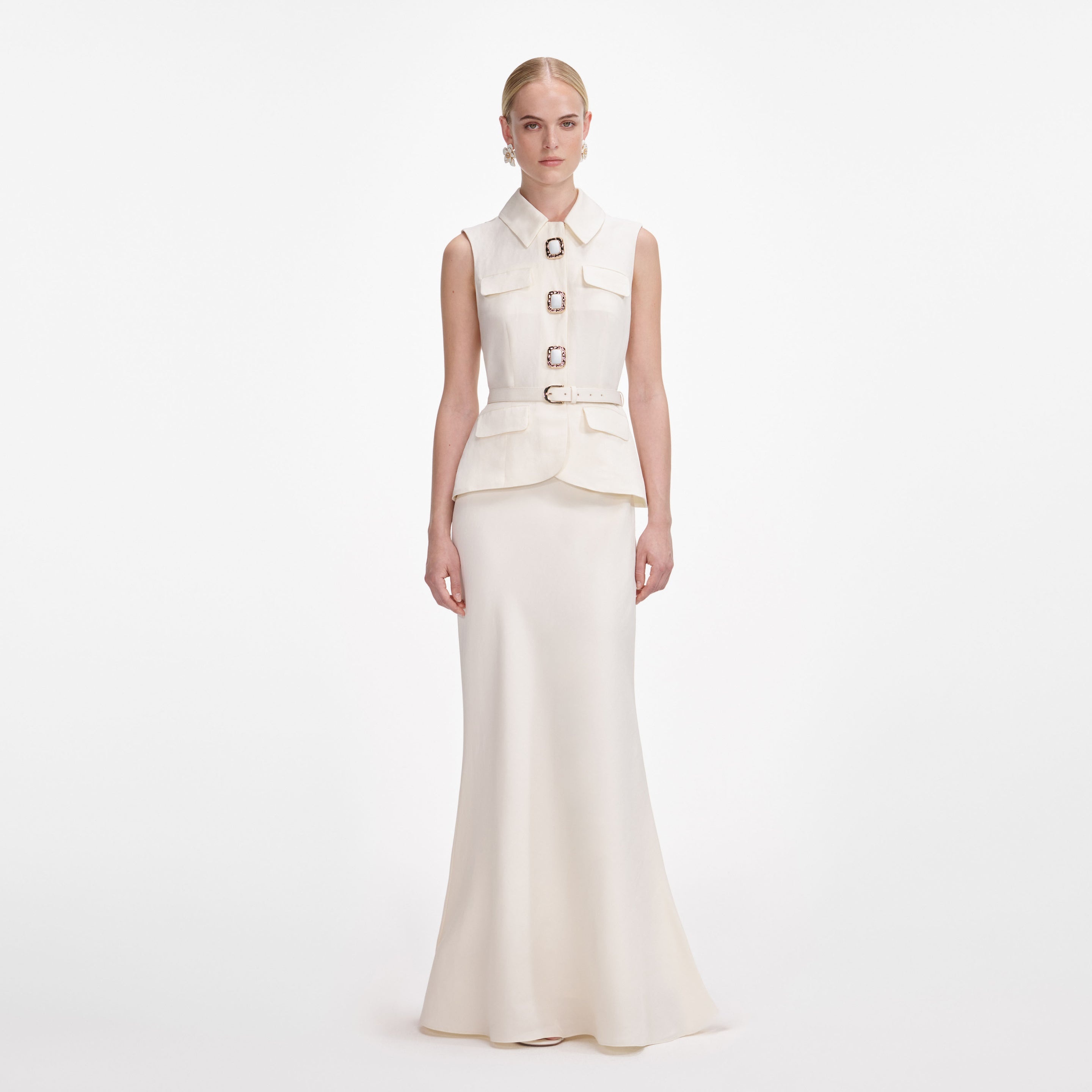 Details & Fit This cream linen maxi dress exudes effortless elegance. Gold & pearl buttons, a belted waist and flowing skirt accentuate it's statuesque silhouette – pair with bold jewellery for a big entrance. This cream linen maxi dress exudes effortless elegance. Gold & pearl buttons, a belted waist and flowing skirt accentuate it's statuesque silhouette – pair with bold jewellery for a big entrance. - Fitted style, take one size up if between sizes - This style has minimal stretch - Button closure down front - Zip closure at side - Removable belt - Model is 5ft10/178cm and wears a size UK 6 - Fitted style, take one size up if between sizes - This style has minimal stretch - Button closure down front - Zip closure at side - Removable belt - Model is 5ft10/178cm and wears a size UK 6 COMPOSITION 62% Viscose 34% Flax 4% Polyamide 62% Viscose 34% Flax 4% Polyamide