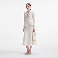 Details & Fit The iconic tailored midi comes reimagined in cream sequin knit for a stylish yet comfortable fit. A belted peplum and sparkling bow motifs add extra glamour – wear with our statement earrings. - True to size - Fabric has stretch - Clasp & popper closure down front - Removable belt - Removable shoulder pads - Model is 5ft10/178cm and wears a size S COMPOSITION Main: 47% Cotton 41% Polyester 12% Wool Lower Body: 40% Wool 32% Polyester 23% Cotton 5% Cashmere (Exclusive Of Decorative Sequins)