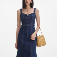 Details & Fit Denim goes demure in this midi dress with its sweetheart neckline and bust & seam detailing. Falling from a cinched belted waist, the flared hem pairs perfectly with ballet flats and boots alike. - Fitted style, take one size up if between sizes - This style has minimal stretch - Zip closure at back - Removable belt - Bust cup detailing - Model is 5ft10/178cm and wears a size UK 6 COMPOSITION Main Fabric: 100% Cotton,