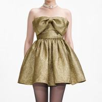 Details & Fit Luxuriously aglow in gold jacquard, this midi dress’ peplum and sculpting fit cut a flattering silhouette. Show off its bow-topped bandeau neckline with a pair of our statement earrings. - Fitted style, take one size up if between sizes - This style has minimal stretch - Concealed zip closure at back - Internal corset - Model is 5ft10/178cm and wears a size UK 6 - Check the Size Guide to find your perfect fit COMPOSITION Main Fabric : 80%Polyester 18% Metallised fibre 2% Elastane Lining1 :100% Polyester Mesh:85% Polyester 15% Elastane Mesh: 100%Polyamide