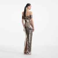 Details & Fit A festive dress for the ages, let the liquid-like sequins and diamante brooch do all the talking. Featuring a sensual cut, enhance the off-shoulder neckline with a pair of our statement earrings. - Fitted style, take one size up if between sizes - Zip closure at back - Fully lined - Internal corset - Diamante brooch embellishment - Model is 5ft10/178cm and wears a size UK 6 COMPOSITION 95% Polyester 5% Elastane