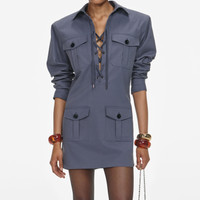 Details & Fit An ode to safari chic, this cotton gaberdine mini dress boasts exaggerated shoulders and lace-up detailing at the front. Statement pockets add utilitarian flair – style with heels for a hot date.An ode to safari chic, this cotton gaberdine mini dress boasts exaggerated shoulders and lace-up detailing at the front. Statement pockets add utilitarian flair – style with heels for a hot date. - True to size - Relaxed fit - Lace ties at front - Removable shoulder pads - Removable belt - Model is 5ft10/178cm and wears a size UK 6 - True to size - Relaxed fit - Lace ties at front - Removable shoulder pads - Removable belt - Model is 5ft10/178cm and wears a size UK 6 COMPOSITION Main: 48% Polyester 26% Lyocell 26% Cotton Binding: 100% Polyester Main: 48% Polyester 26% Lyocell 26% Cotton Binding: 100% Polyester
