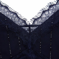Details & Fit See and be seen in this V-neck cami top which unites rhinestone pinstripes with romantic lace trims. Pair with denim for date night or go for an impactful total look with our matching suit and heels. - True to size - Loose fit - Unlined style - Lace detailing - Matching separates available - Model is 5ft10/178cm and wears a UK size 6 COMPOSITION Main: 64% Polyester 31% Viscose 5% Elastane Lining: 100% Polyester Trim: 100% Polyamide