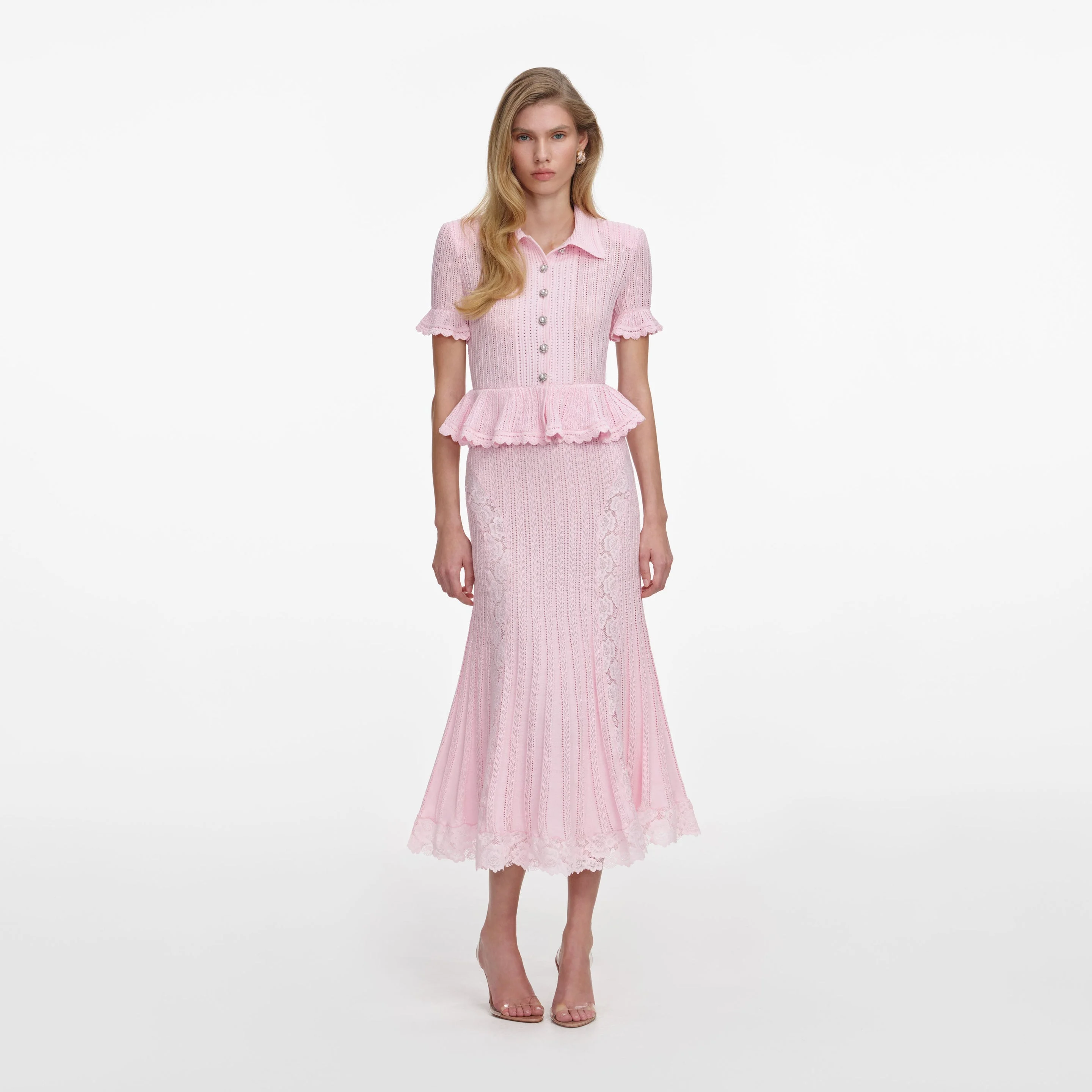 Details & Fit A front cut-out adds a daring twist to this pink knit midi dress. Lace detailing spotlights its dynamic skirt whilst a peplum waist frames the form. Pair with heels for weddings and garden parties. - True to size - Fabric has stretch - Button closure down front - Removable shoulder pads - Peplum waist - Model is 5ft10/178cm and wears a size S Composition Upper Body: 74% Viscose 20% Polyamide 6% Polyester Lower Body: 81% Viscose 16% Polyamide 3% Polyester Lining: 77% Viscose 23% Polyamide Trim1: 45% Viscose 44% Polyamide 8% Polyester 3% Elastane Trim2: 100% Polyester (Exclusive Of Trimmings)
